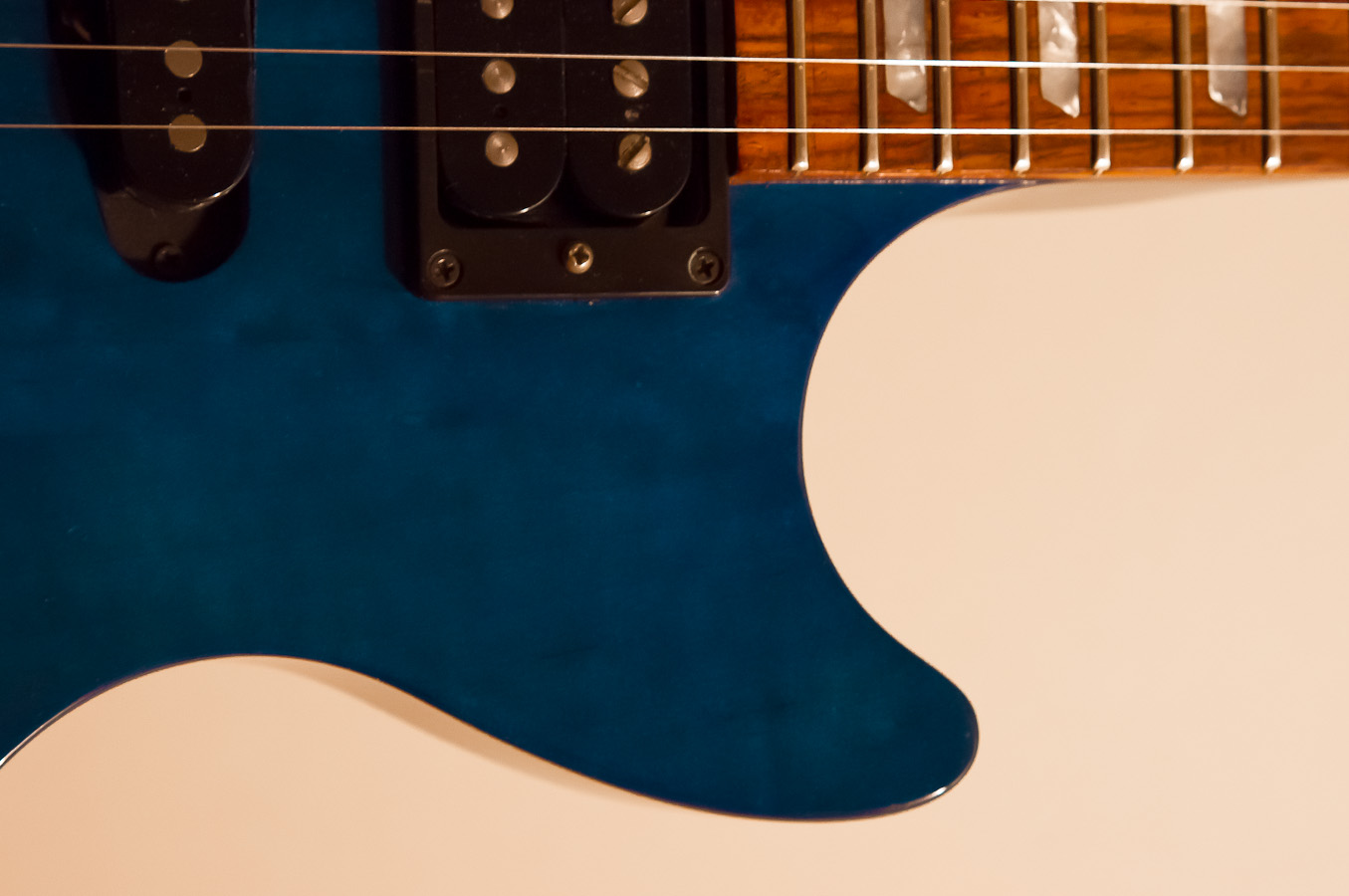 Valóban a ritkaságát bizonyítja, mennyire kevés információ és kép kering róla a neten, különösen ebben az érdekes (szintén egyesek szerin ronda) kék színben, mely alatt halványan áttetszik a juhar fedőlap erezete. Én egyébként szeretem a kék gitárokat és ennek nagyon érdekes a színe, megvilágítástól függően a közepes, enyhén zöldesbe hajló tengerszem-kék, vagy egész sötét tengerkék is lehet. Külön érdekes, hogy a hátoldala és a nyak nem feketére, hanem nagyon sötét indigókékre van fényezve. Az meg hab a tortán, hogy minden hardware fekete rajta, szerintem nagyon dögösen néz ki így.