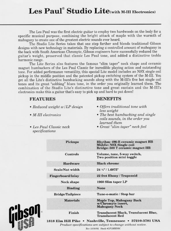 És valóban, ez a mindössze 1992-95 közt gyártott Les Paul szakít a hagyományos Gibsonos jellemzőkkel: először is, a Lite változatról van szó.