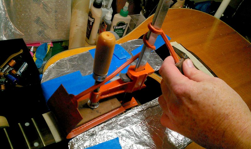 A normál, ragasztott nyak levételénél az a módszer a szokásos, hogy a nyak és a test találkozásánál levő bund után következőt kivesszük és két pici lukat fúrunk a bund helyébe, majd jöhet a kávéfőző.