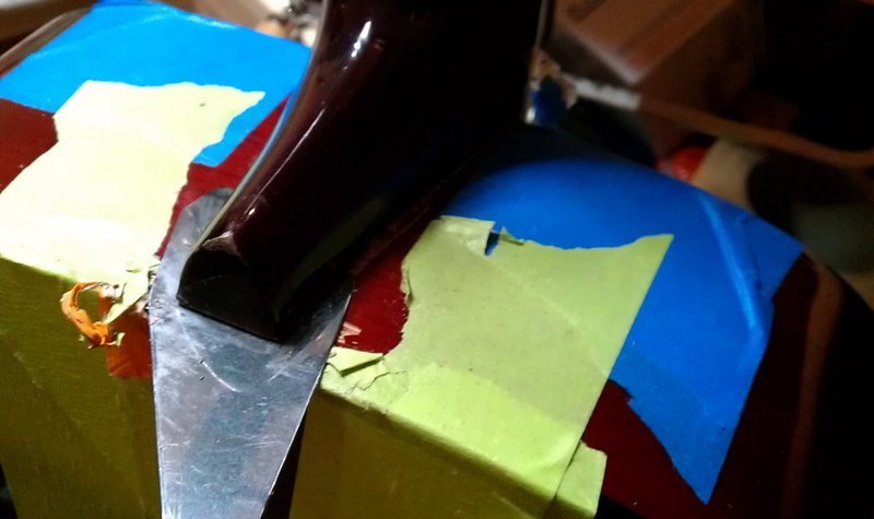 Szépen megmelegítettük a fogólapot, hogy a ragasztó engedjen, és a széles lapú pengével óvatosan, több lépésben alányúlva elkezdtük szétválasztani, ez több melegítés-vágás-feszítés ciklussal történt és sikerült is anélkül, hogy megsérült volna a fényezés, amit persze körülötte leragasztottunk előtte.
