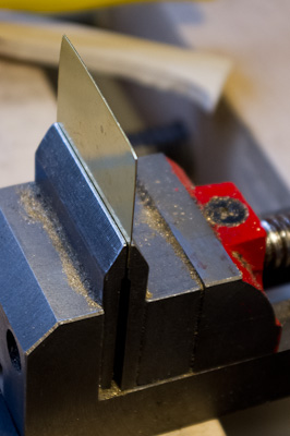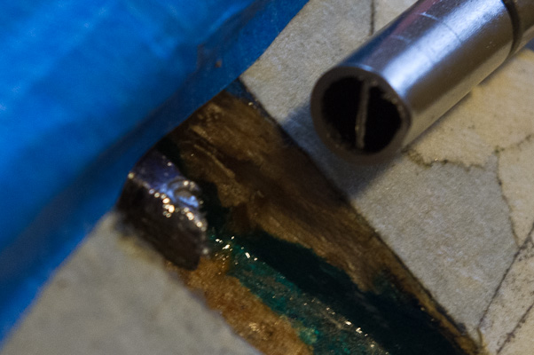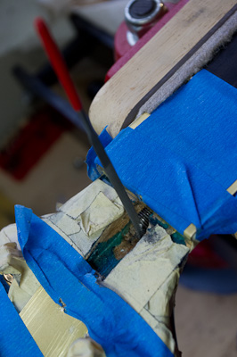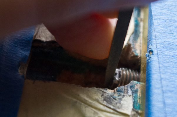 Elhatároztam, hogy tengelyirányban „kinyitom” a csonkot, azaz vágok bele egy hosszanti rést és egy csavarhúzót fogok használni a forgatáshoz. Mégpedig megakadályozandó, hogy a két fél darab a feszítéstől szétnyíljon és eltörjön, olyan csavarhúzót, amelyiknek a vége egy palásttal van körbevéve, eredetileg azért, hogy a kényes helyen történő csavarozásokkor biztosan ne ugorjon ki a csavar fejének vájatából. A StewMac kis készletében van is egy ilyen.