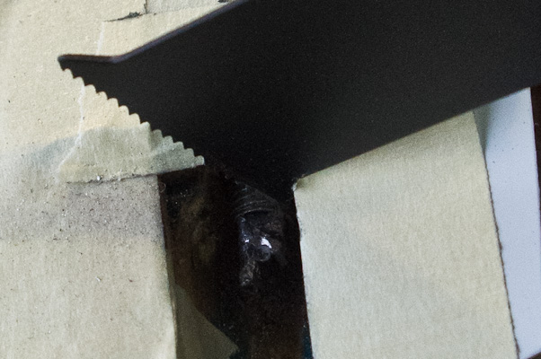 Az újabb vágat az újabb anyával, jól láthatók a fűrész nyomai a rézlemezen, még jó, hogy nem csak leragasztottam