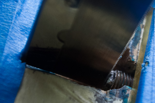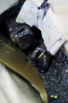 Tengelyirányú vágat, hogy csavarhúzóval forgassam. Középen a beletört acéltüske, ami egy percenként nyírta le a fűrészfogakat.