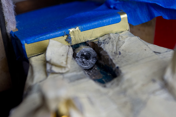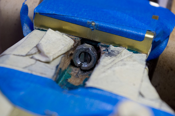 Először leütögettem az anyát, fáradtságos munkával lekapargattam, véstem az epoxi maradványait majd készítettem egy újabb levékonyított anyát, ezúttal okulva a tapasztalokból már négy rovátkával rajta, hogy könnyebb legyen tekerni. Egy keveset ledolgoztam még a fából a menetes rész körül, hogy az anya beljebb mehessen.