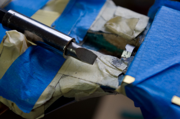 A letört végű csonkot is természetesen le kellett vágni – ez megint fejtörést okozott, mert abba a csatornában semmilyen fűrész nem fér el. Gondolkodtam, hogy a Dremel vágókorongjával esetleg megoldható, de ahhoz is nagyon szűk volt a hely, ráadásul arról tudtam, hogy könnyen megszalad, kiugorhat a vágásból, és nem szerettem volna a szépséges nyakat elmetszeni valahol…