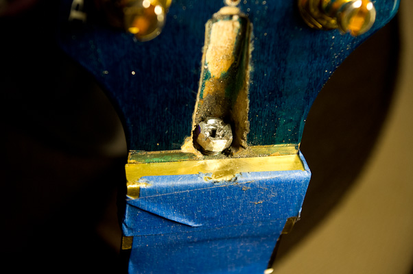 Előkaptam a kis japán faragóvéső készletem és a legkisebb vésővel óvatosan leválasztottam pár mm fát körötte, oldalt és alul is. Kicsit aggódtam, nehogy túl sokat vegyek ki, mert a nyak itt a legvékonyabb és pont itt támaszkodnak fel a húrok, márpedig 5 basszushúr feszítése nem csekélység – de bíztam Pedulla úr anyagválasztásában. 🙂